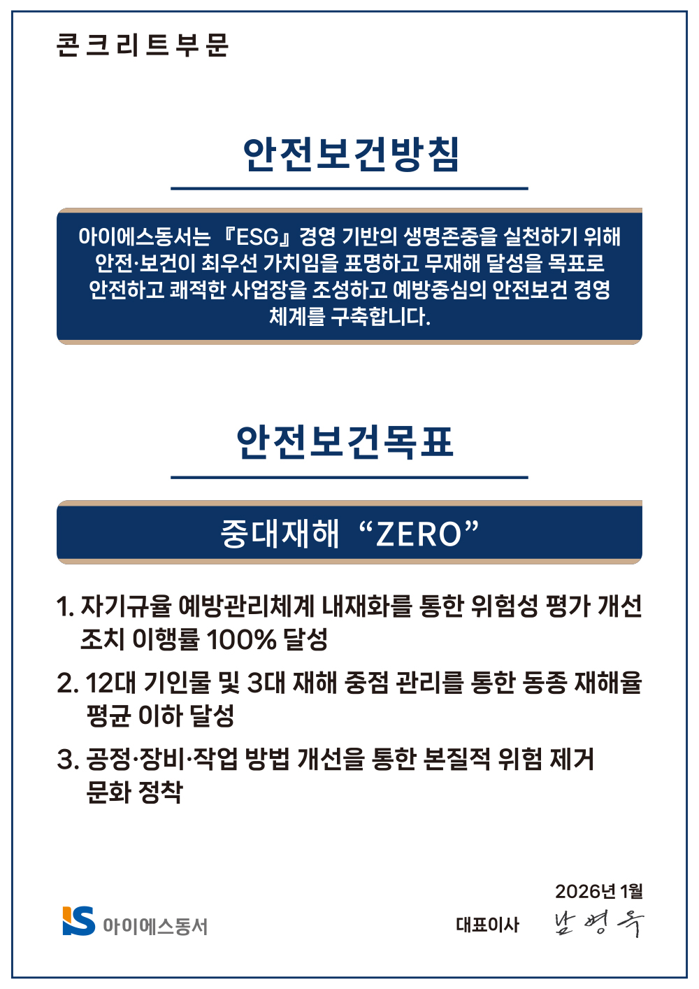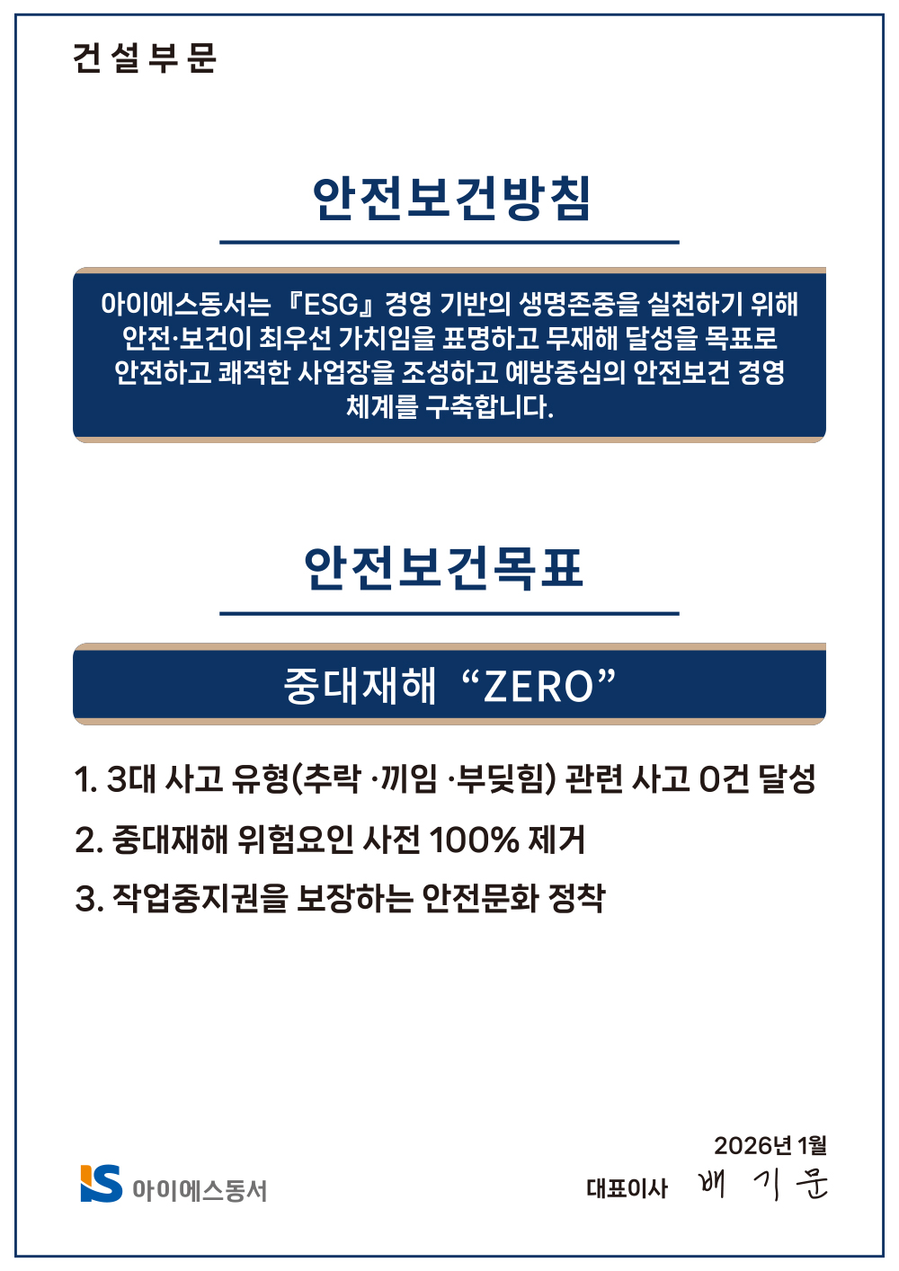 In order to enhance the value of 'safety', which is becoming increasingly important starting with the Severe Accident Punishment Act, IS Dongseo establishes safety and health policies and goals according to the characteristics of its major business divisions and disseminates them to all executives and employees and partner companies to promote advanced safety and health. We are creating a culture.